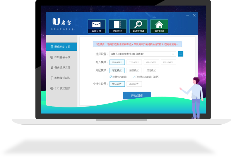 下载并且运行U启宝U盘启动软件,然后点击"制作启动U盘"选项,插入u盘等待软件成功读取到u盘之后,点击"开始制作"进入下一步操作。如下图所示